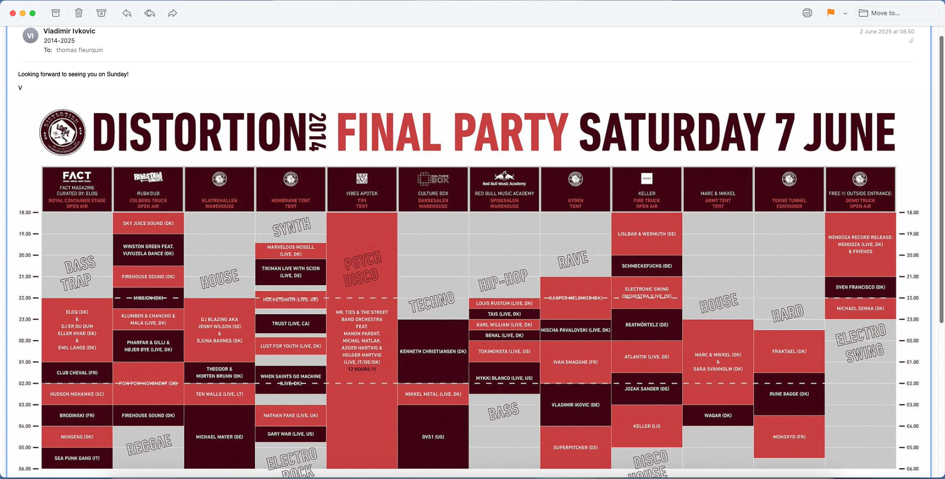 Above is a screenshot from an email from Vladimir Ivkovic who had kept the schedule from 2014 and sent it back just before his return in 2025.